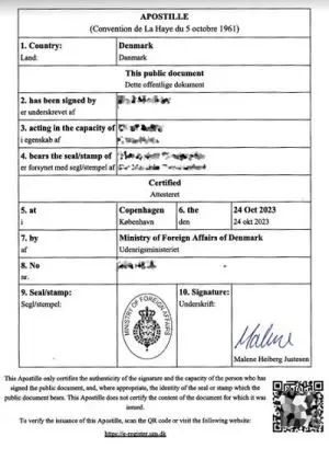 Apostille Danish certificates of origin, certificates of free sale, commercial invoices, product health certificates, GMP certificates and other trade documentsID documents