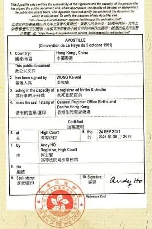 Apostilles for Hong Kong birth, death and marriage certificates can be obtained from the High Court. Apostilles can be applied to original birth and death certificates issued by the General Register of Births and Deaths, and marriage certificates signed by the Deputy Registrar of Marriages. Apostilles can be applied to original certificates or to true copies certified by a notary public. Marriage certificates signed by civil celebrants or issued by a church or temple can only be apostilled as notarized copies (a certified copy must be obtained from the Record Office of the Marriage Registry if the apostille is required on an original certificate).