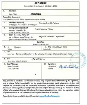 Apostilles in Jamaica can be obtained for official documents such as Jamaican Marriage certificates, Birth and Death certificates, Criminal Record Certificates, University diplomas and transcripts, divorce certificates, and other documents certified in Jamaica by a notary.
