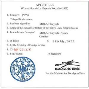 Japan Apostilles follow the standard format laid down in the Apostille Convention. Some examples of Japanese documents certified with Apostille stamps: