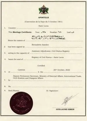 Apostille St Lucia marriage certificates, birth and death certificates. We can obtain official copies of St Lucia marriage certificates and other civil status certificates from the Registrar of Civil Status, so there is no need to send the original certificate to St. Lucia to obtain the apostille.